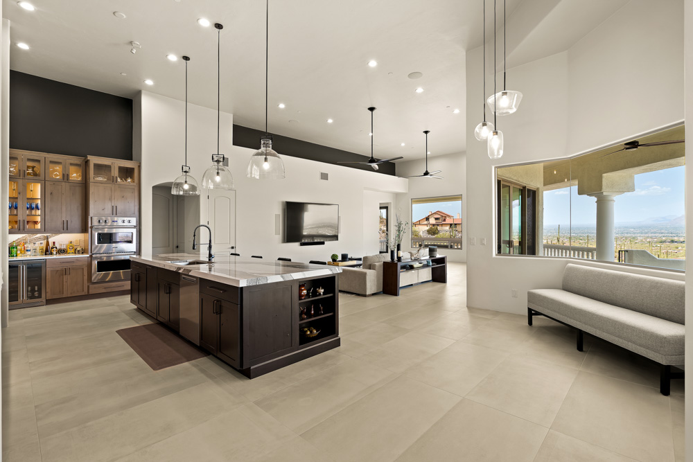 The original kitchen was boxed in with pillars, an oversized soffit, and outdated finishes. We reimagined the entire layout, removing obstructions, reconstructing the island, and adding modern cabinetry, countertops, and custom lighting. The result is a centerpiece kitchen that blends seamlessly into the open living space.