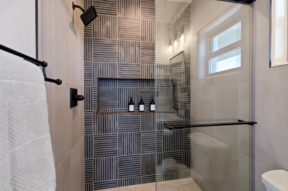 The master bathroom was redesigned with luxury in mind, featuring sleek tile details, bold black fixtures, and a spa-like bathtub and shower. The guest bathroom received a fresh update with a clean, modern rip-and-replace remodel.