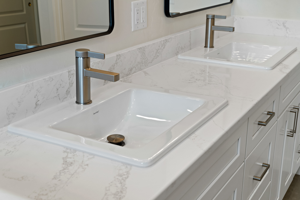 • Rectangular sinks paired with brushed nickel single-handle faucets