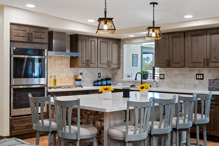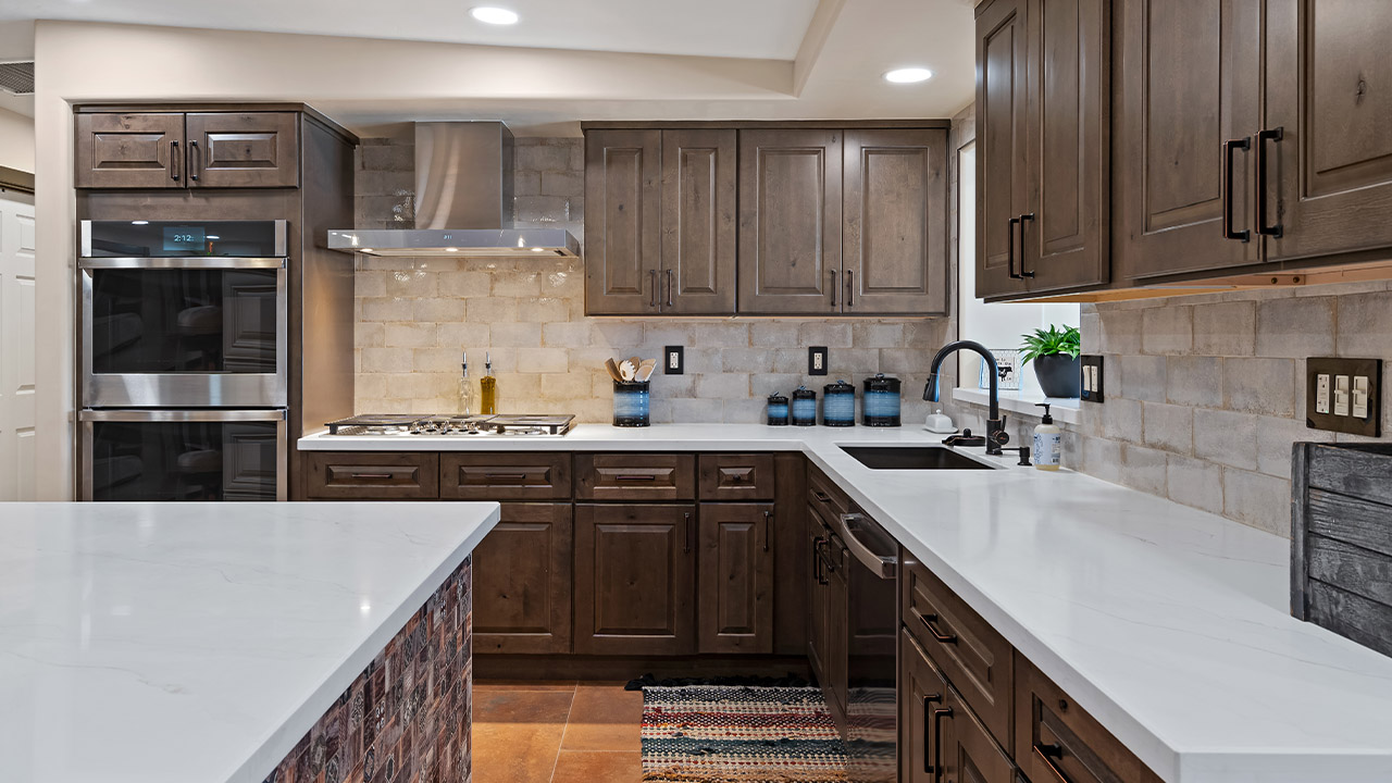 To complete the remodel, new lighting fixtures provide both ambiance and practicality, highlighting the beauty of the countertops and the large island while creating a warm, inviting atmosphere. This remodeled kitchen blends contemporary design with rustic elements, creating a stylish, functional space that’s perfect for both everyday use and entertaining.