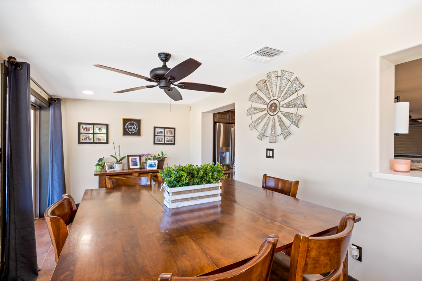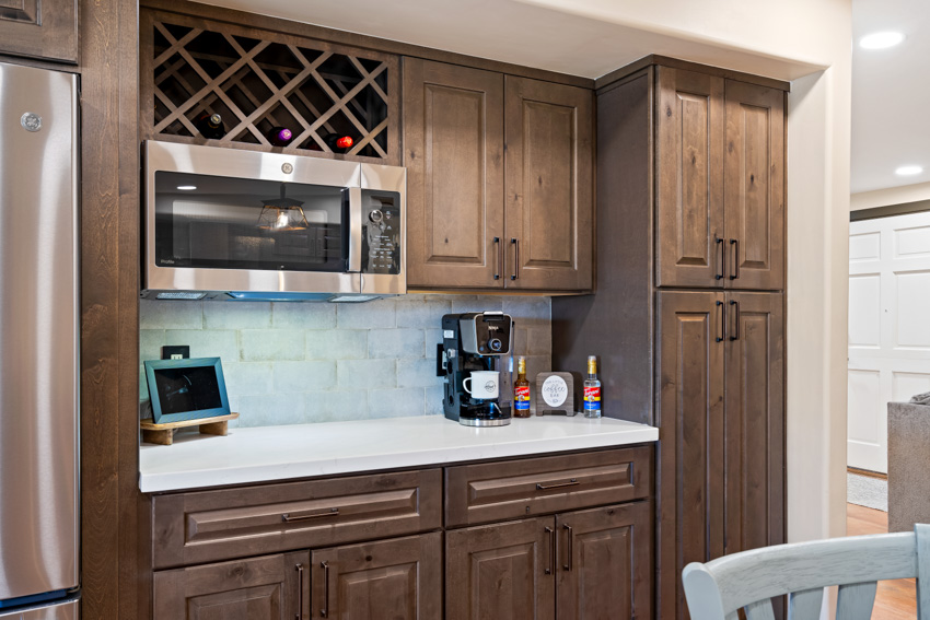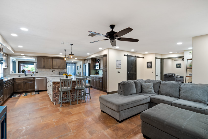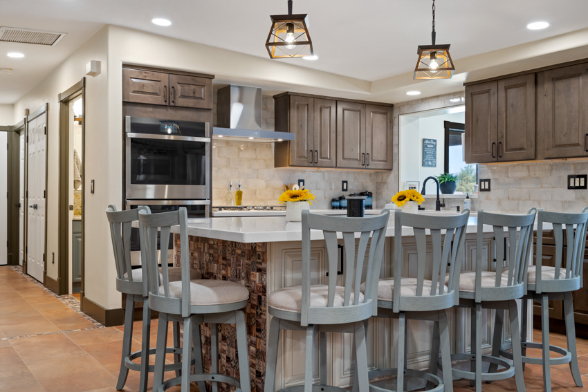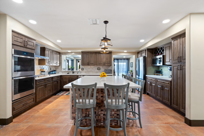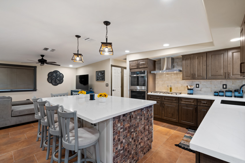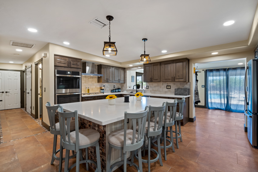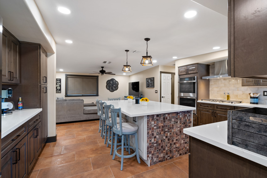 The stunning white quartz countertops are the perfect contrast to the rich cabinetry, with veins of warm brown that bring depth and character to the space. New, state-of-the-art appliances elevate the kitchen’s functionality, seamlessly integrating with the sleek design. The flooring has been replaced with new Southwest-inspired modern tile, offering a vibrant and earthy feel that ties the entire space together.