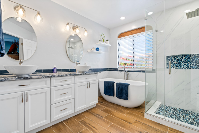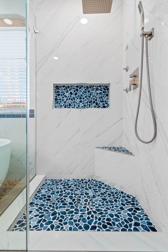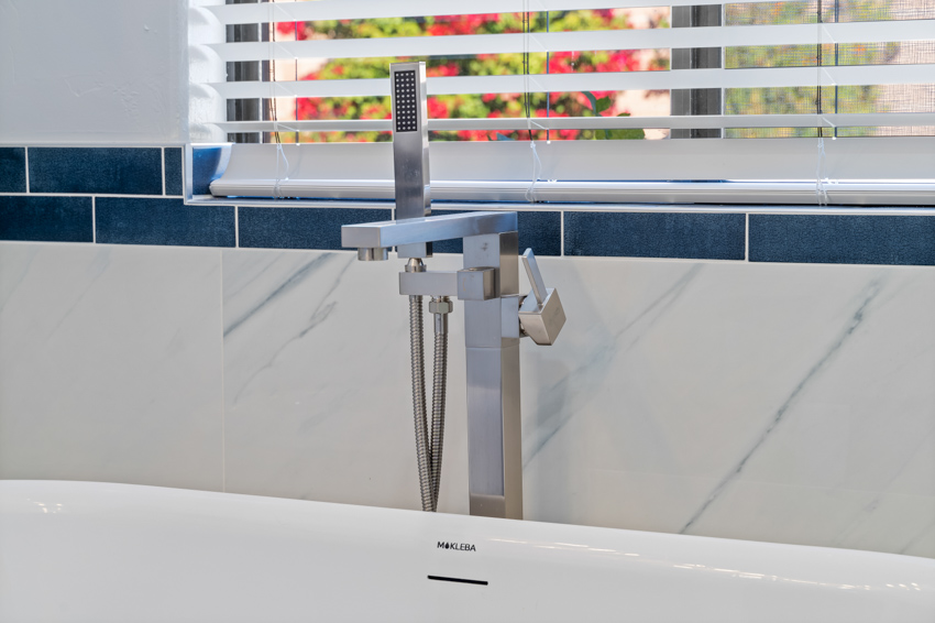 Step into luxury with this stunning bathroom remodel for the Taylor family in Tucson, Arizona. Anchored by a freestanding bathtub framed by dark blue subway tiles, the space radiates timeless elegance. Overhead, contemporary lighting adds modern sophistication, while a spacious marble walk-in shower with frameless glass panels and intricate mosaic accents offers a rejuvenating retreat.